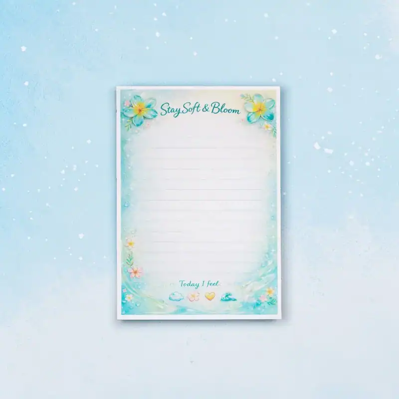 • Σημειωματάριο Α5 “Stay Soft & Bloom”: Περιλαμβάνει 50 ριγέ φύλλα, ιδανικά για να φιλοξενήσουν τις σκέψεις, τα όνειρα και τις σημειώσεις σου. Στο κάτω μέρος κάθε σελίδας, το ειδικό section “Today I feel” σε προσκαλεί να κάνεις ένα pause και να καταγράψεις τη διάθεσή σου.